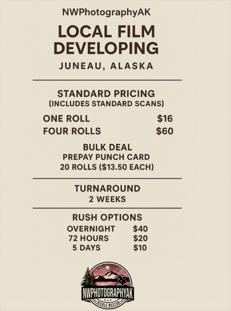 No outsourcing. No long waits. Every roll is developed right here in Juneau, with the same intentionality and care I put into each session.